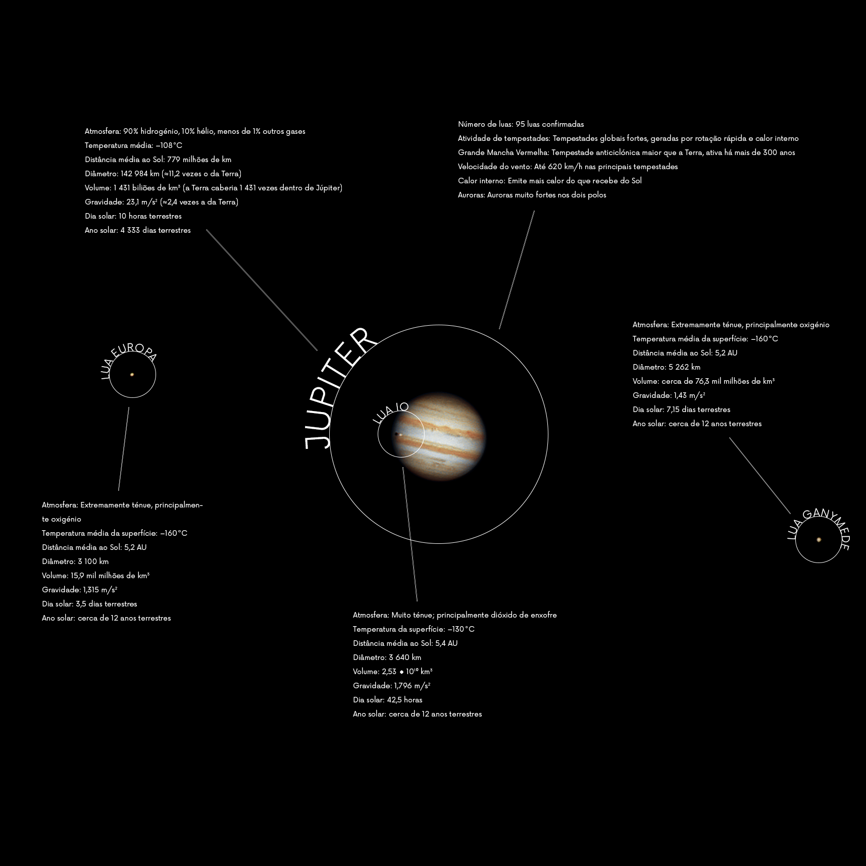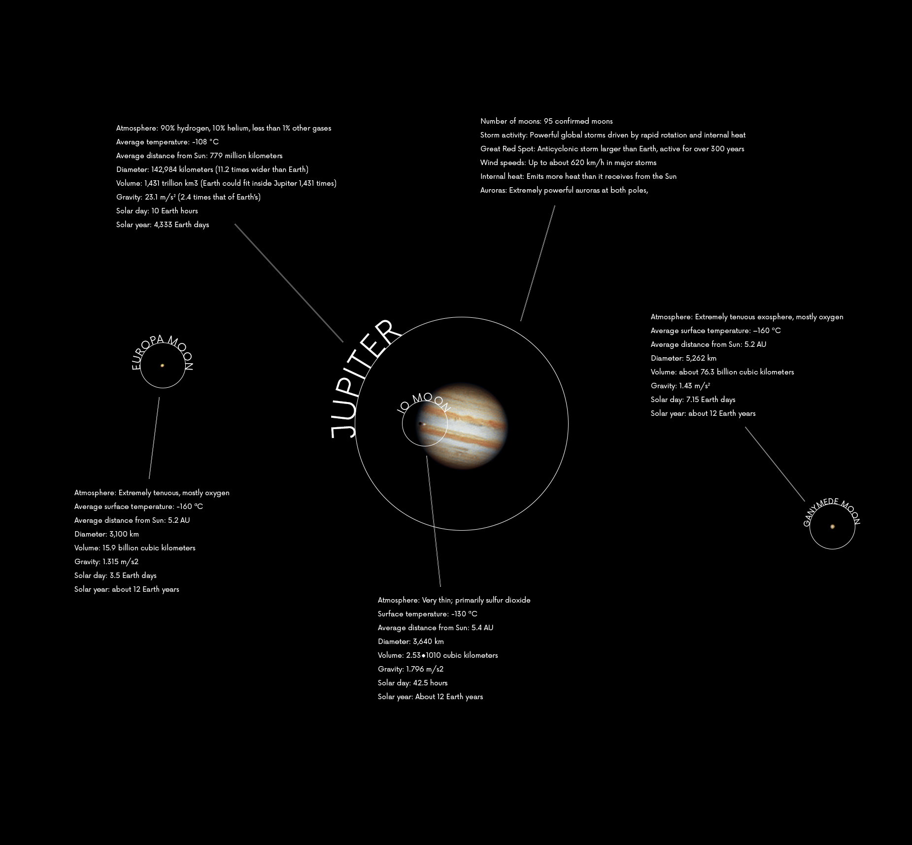 Io, Europa e Ganymede fazem parte das quatro maiores luas de Júpiter, descobertas por Galileo Galilei em 1610, sendo algumas das mais estudadas do Sistema Solar. Io é o mundo mais volcanicamente ativo do Sistema Solar, com centenas de vulcões e atividade interna gerada pelas forças de maré de Júpiter e das outras luas.
