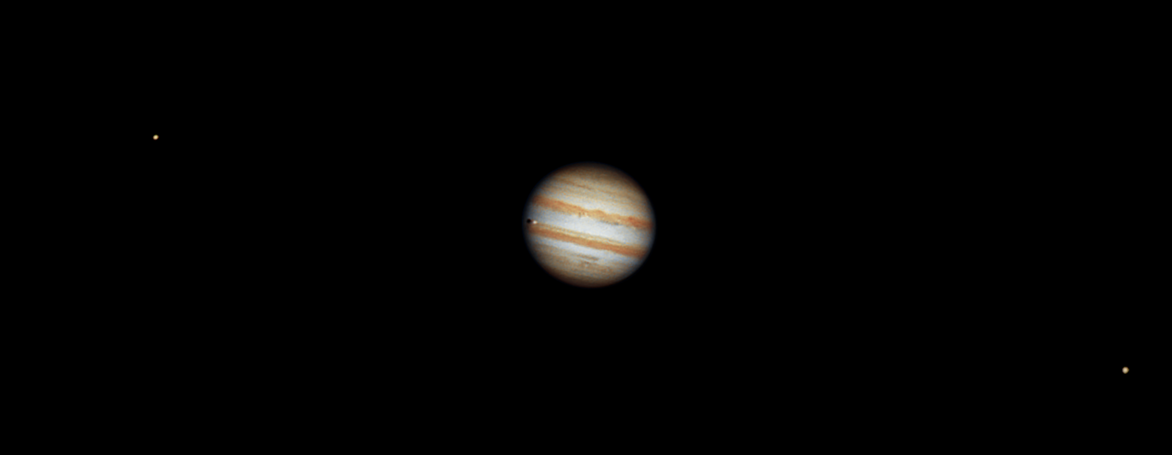 Após várias noites a tentar resolver problemas técnicos que me impediam de capturar Júpiter a cores, finalmente consegui fazê-lo. Esta é a minha primeira fotografia de Júpiter a cores, capturada numa única sessão. Consegui também apanhar três das luas galileanas, Io, Europa e Ganymede, mesma imagem, com destaque para a sombra de Io projetada sobre o magnífico planeta.